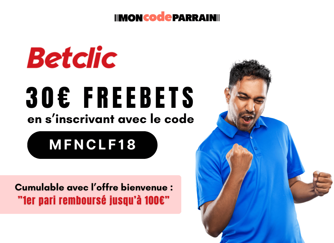 Biensûr ! Vous pouvez profiter de l'offre de parrainage Betclic avec le code parrain MFNCLF18. Elle s'ajoute à l'offre de bienvenue. Cette offre vous rembourse votre premier pari jusqu'à 100€.